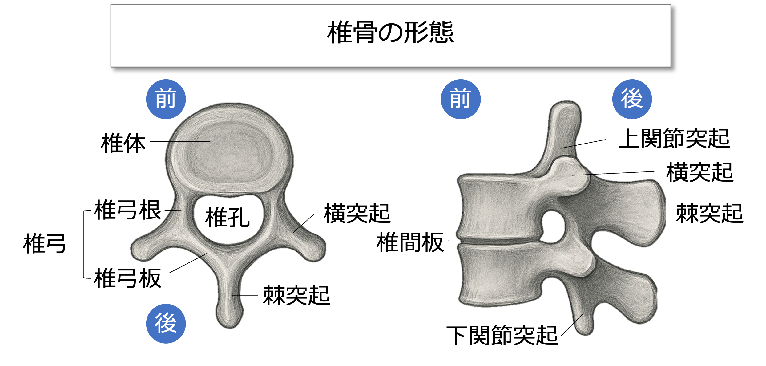 脊柱は、頸椎(首の骨)、胸椎、腰椎、仙椎、尾椎から構成されており、主に体の支持、体幹の運動、中枢神経である脊髄の保護の役割を担います。