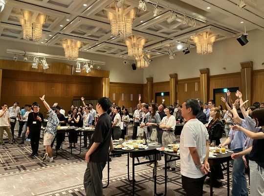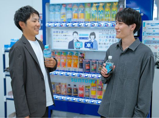 強いチームワークを発揮するには、社員同士の円滑なコミュニケーションが欠かせません。そこで、普段からの交流を促すべく、ペアでドリンクが無料でもらえる自販機を社内に設置。毎日、多くの社員が活用しています。また、社員が一堂に集う交流パーティーではさまざまな催し物が企画され、豪華景品が当たる大抽選会などもあり、大いに盛り上がっています。