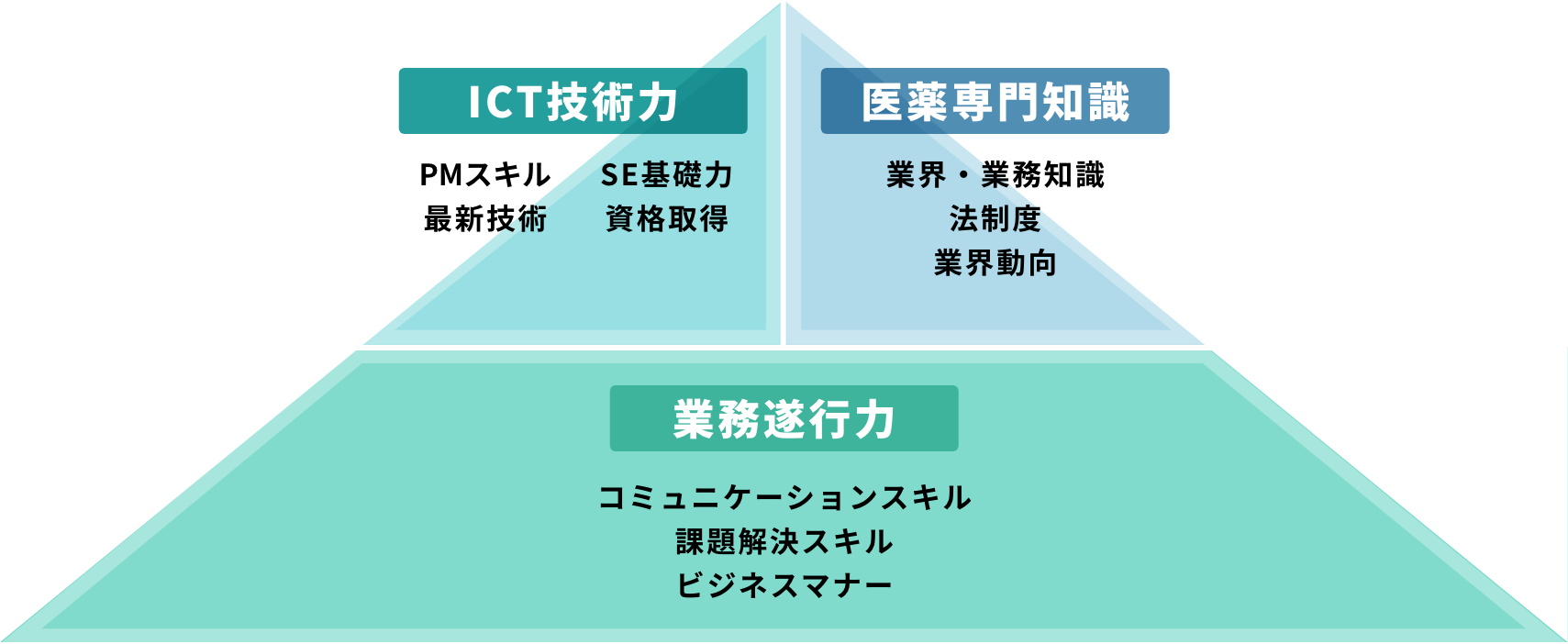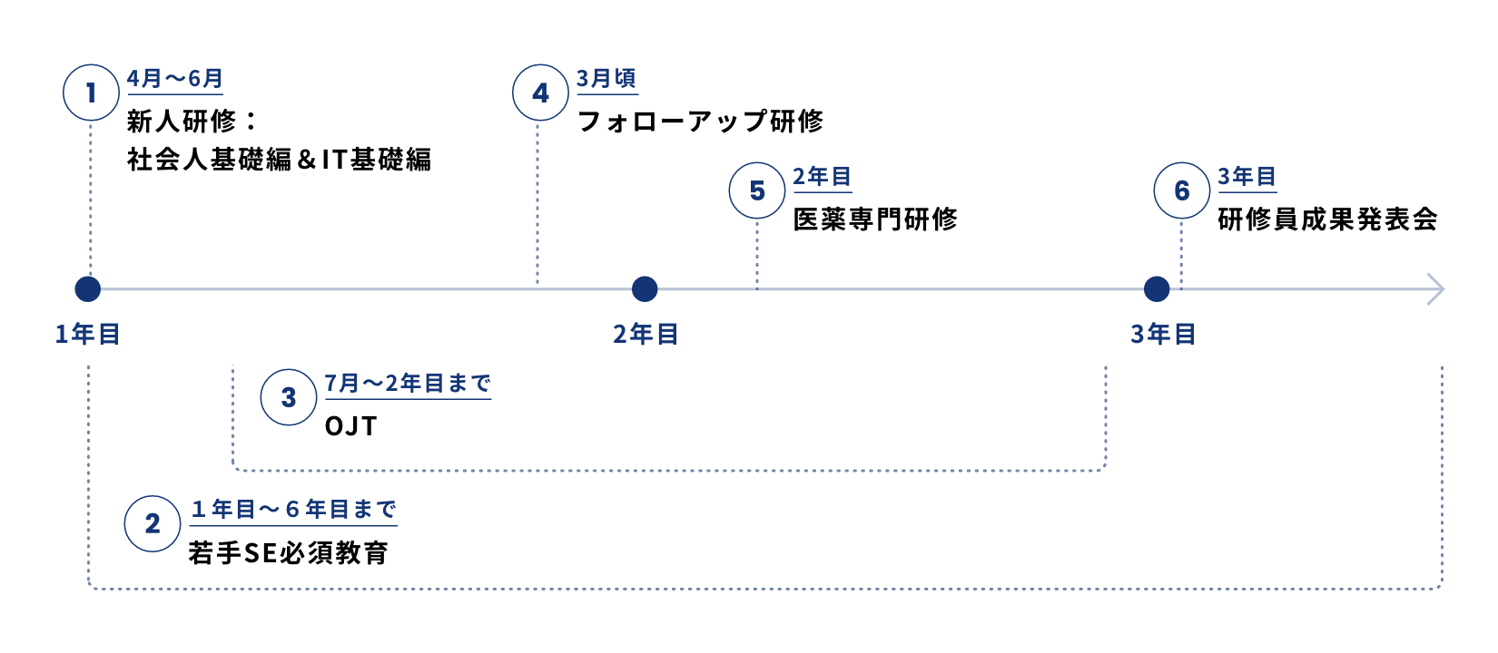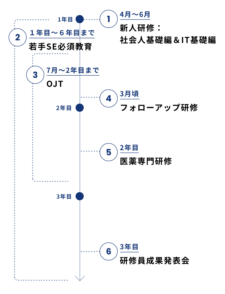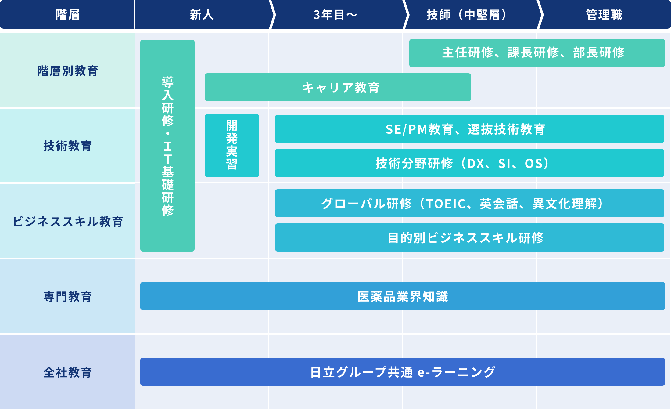社員一人ひとりがベースとなる業務遂行力を高めながら、ICT技術力と医薬専門知識を習得していくことで、医薬品業界への大きな貢献をめざしていきます。この方針のもと、日立PIではさまざまな研修プログラムを設け、多くの成長機会を提供しています。